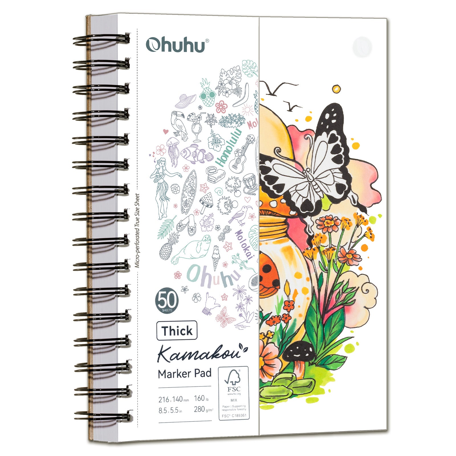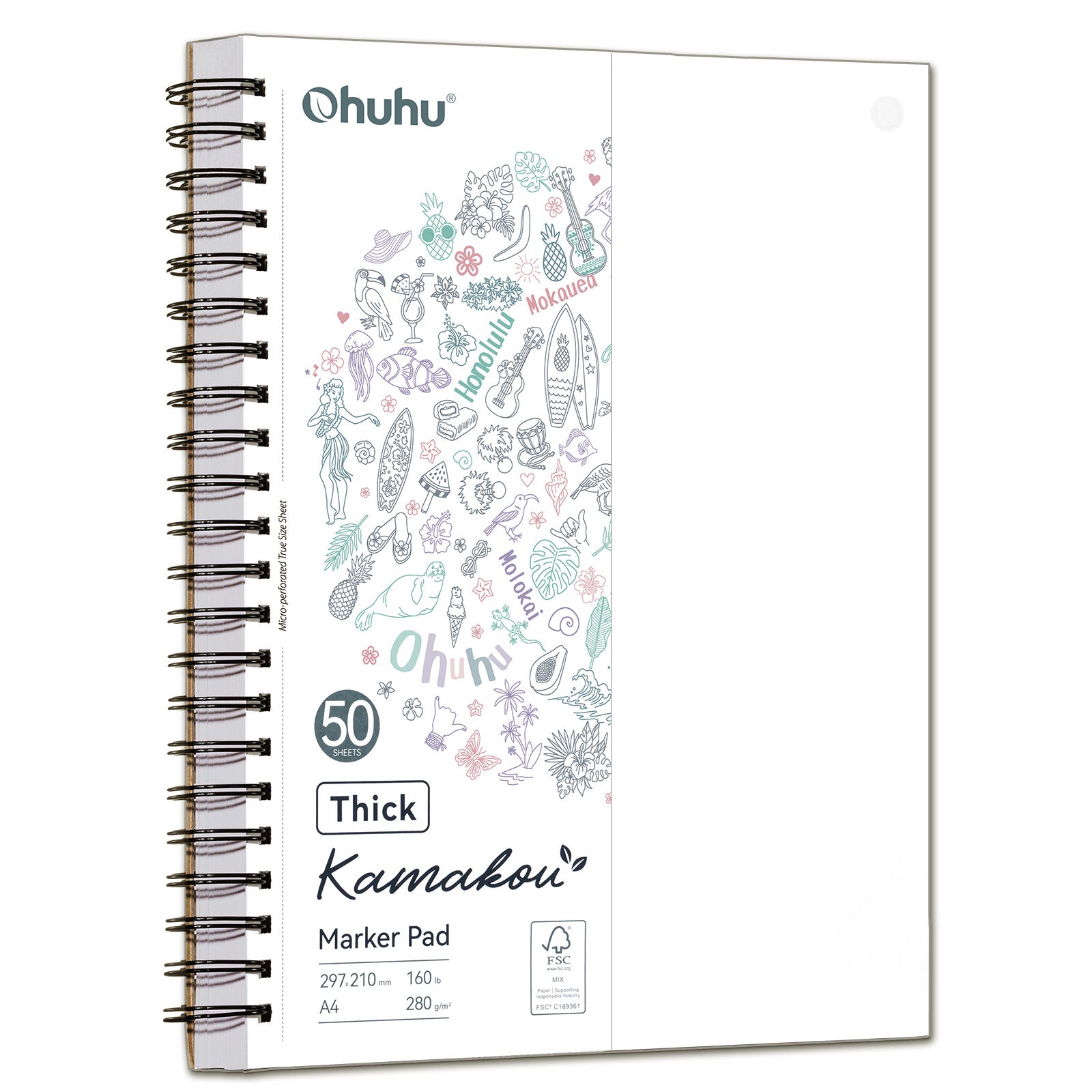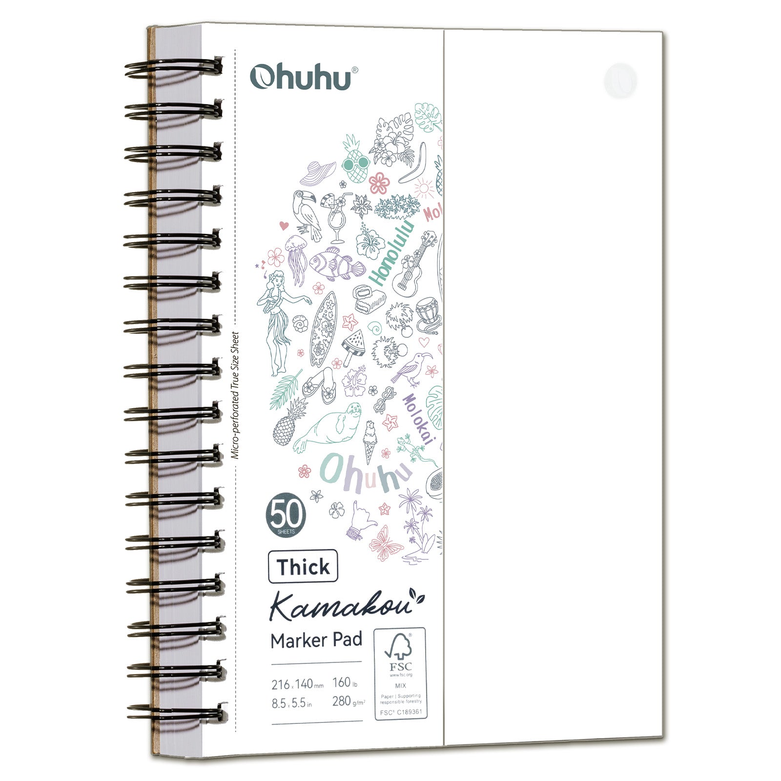 Ohuhu second-generation double-sided marker paper, made from 160 lb/280 gsm FSC-certified paper. The warm white paper provides a comfortable drawing experience, and its smooth, even surface pairs perfectly with Ohuhu alcohol markers, delivering enhanced color performance even with lighter shades. Ink drying time is significantly improved compared to Ohuhu 90 lb/150 gsm marker paper, making it ideal for artists who prioritize faster drying times and prefer bright white paper.