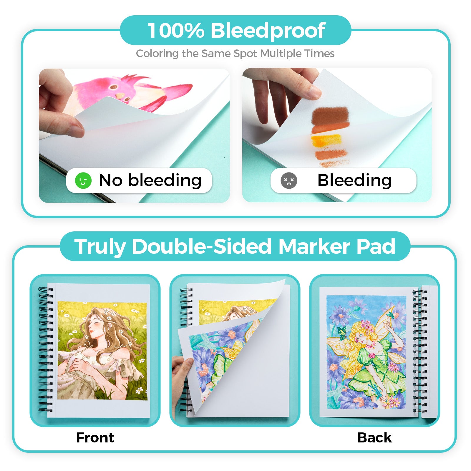 The thickness of the bleedproof sketchbook pages ensures that ink won't pool or bleed into the next page; you can use the backside to draw on too. Each sheet of this marker pad features a double-sided texture, offering up 100 pages total to explore your professional or beginner creativity.