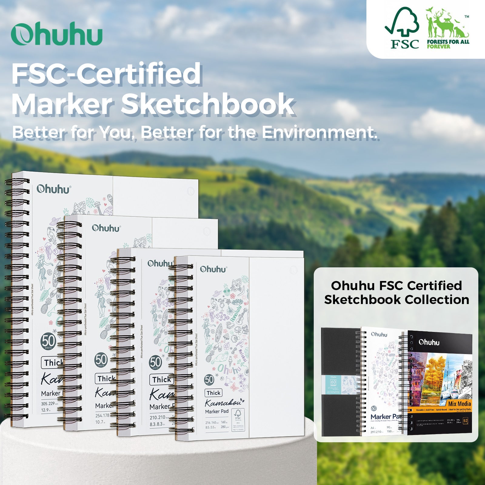 Ohuhu second-generation double-sided marker paper, made from 160 lb/280 gsm FSC-certified paper. The warm white paper provides a comfortable drawing experience, and its smooth, even surface pairs perfectly with Ohuhu alcohol markers, delivering enhanced color performance even with lighter shades. Ink drying time is significantly improved compared to Ohuhu 90 lb/150 gsm marker paper, making it ideal for artists who prioritize faster drying times and prefer bright white paper.