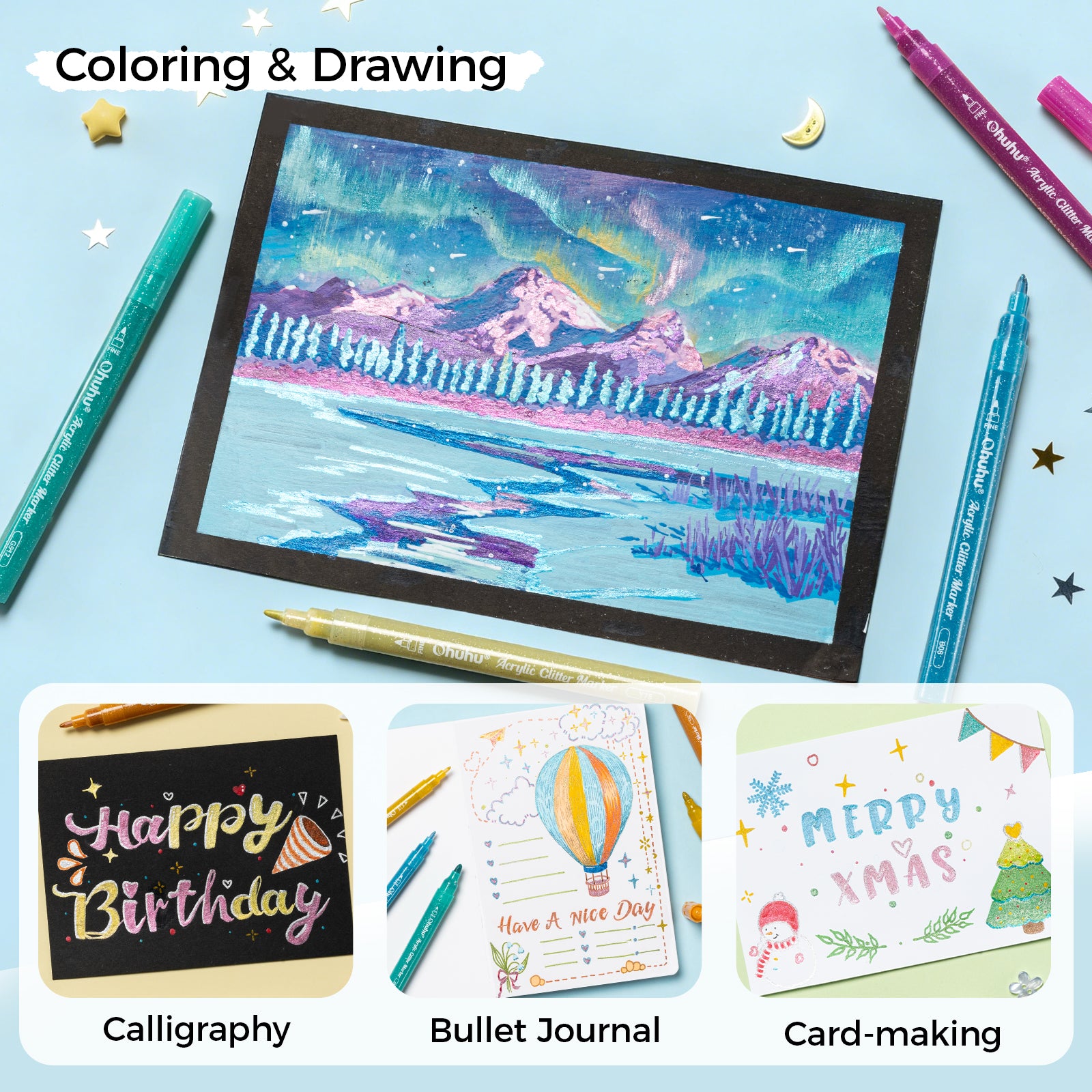 The Ohuhu Glitter Metallic Pens provide an expansive array of creative possibilities. With their smooth ink, durable tips, and crisp and clear lines, this range of pens can be used to make precise fine strokes or to fill wide irregular areas. Unleash your imagination with Ohuhu!